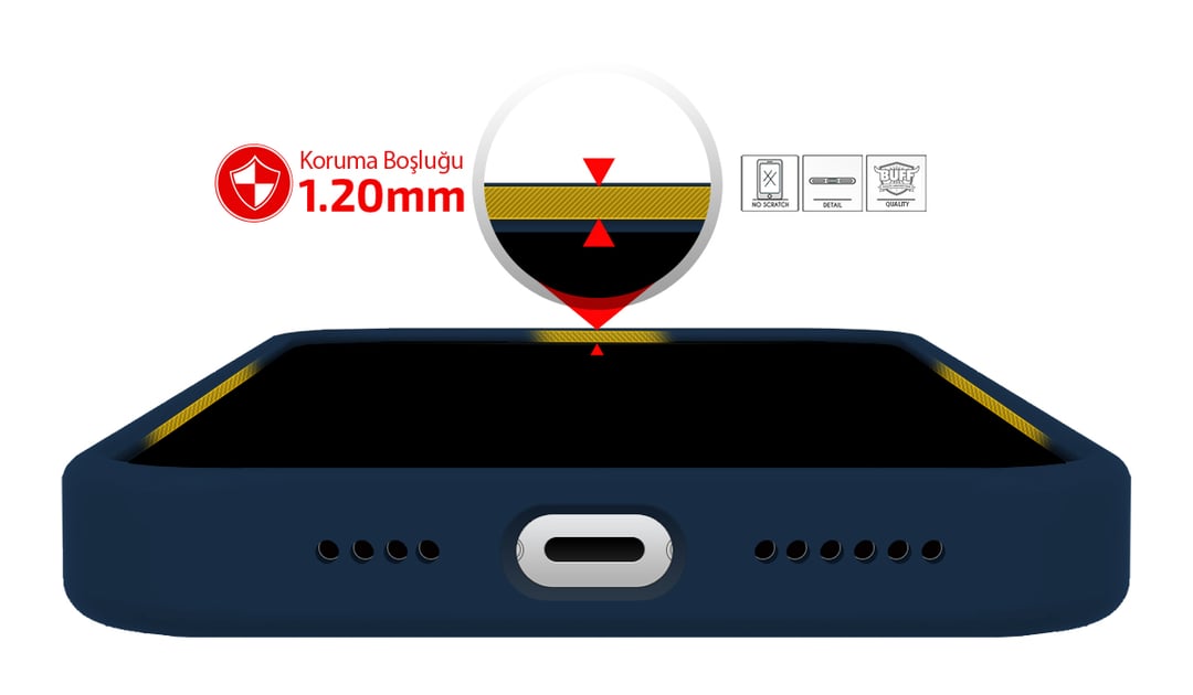 1.2 milimetre uzunluğundaki dış kenar payı ile cihazınızın ekranı, yüzey ile asla temas etmez, darbelere - çizilmere karşı korumaya yardımcı olur.